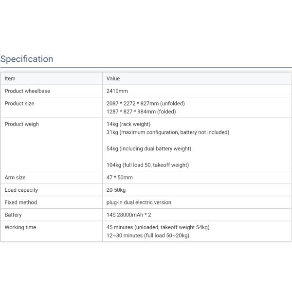 | Product weigh | 14kg (rack weight) 31kg (maximum configuration, battery not included) 54kg (including dual battery weight) 104kg (full load 50, takeoff weight) |